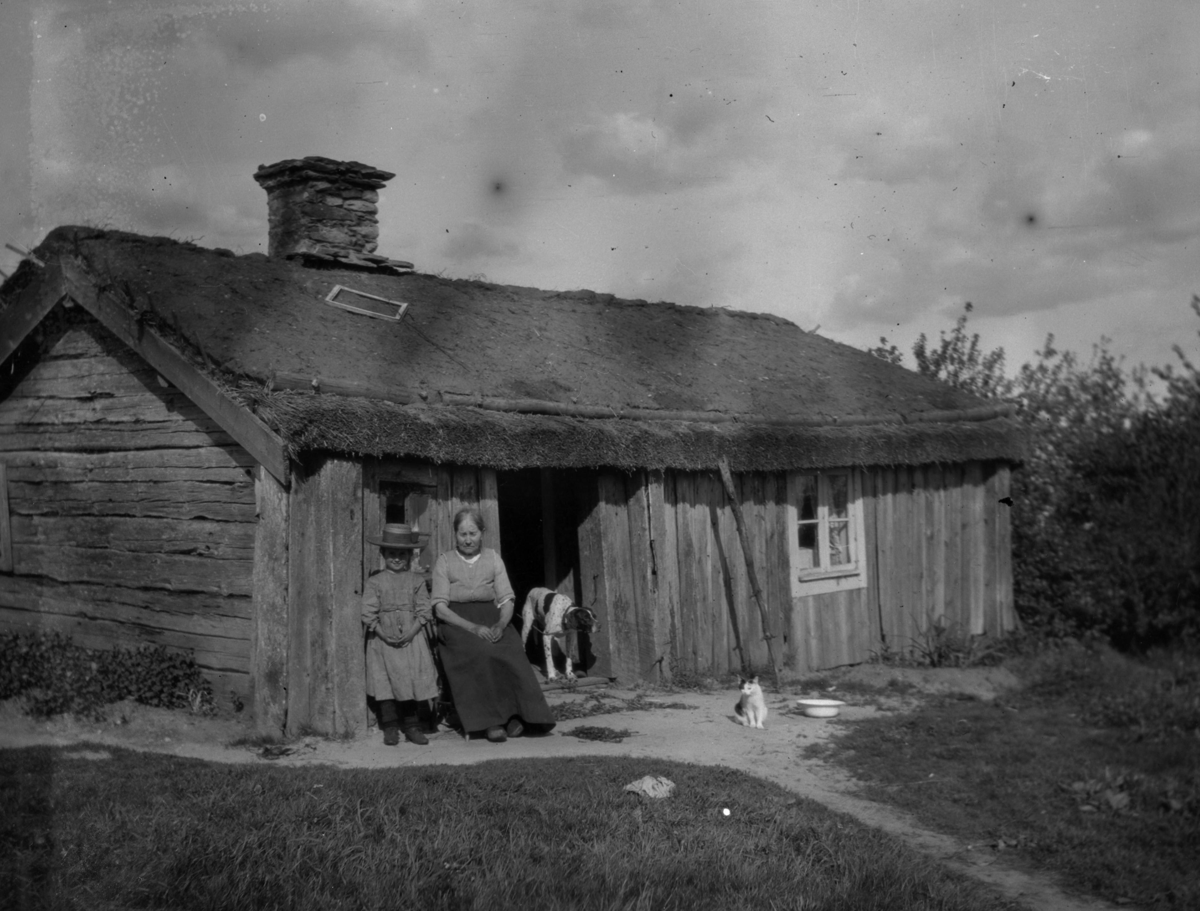 • Gammal kvinna och flicka vid litet trähus, halmtak, stor hund, katt.