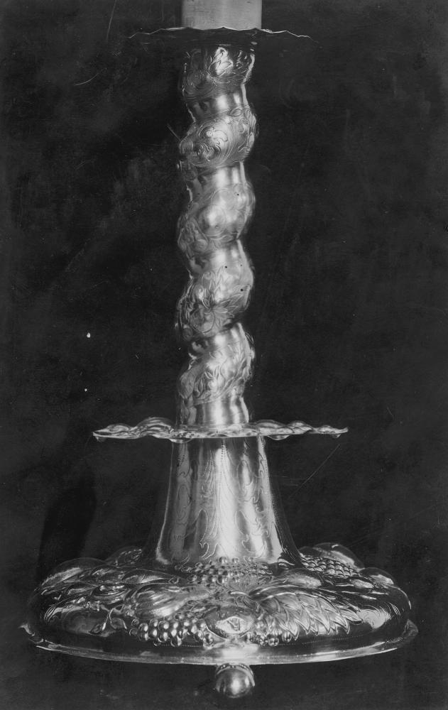 • Ljusstake - Skara. Stämpel: "Tillhör E. Fischer".