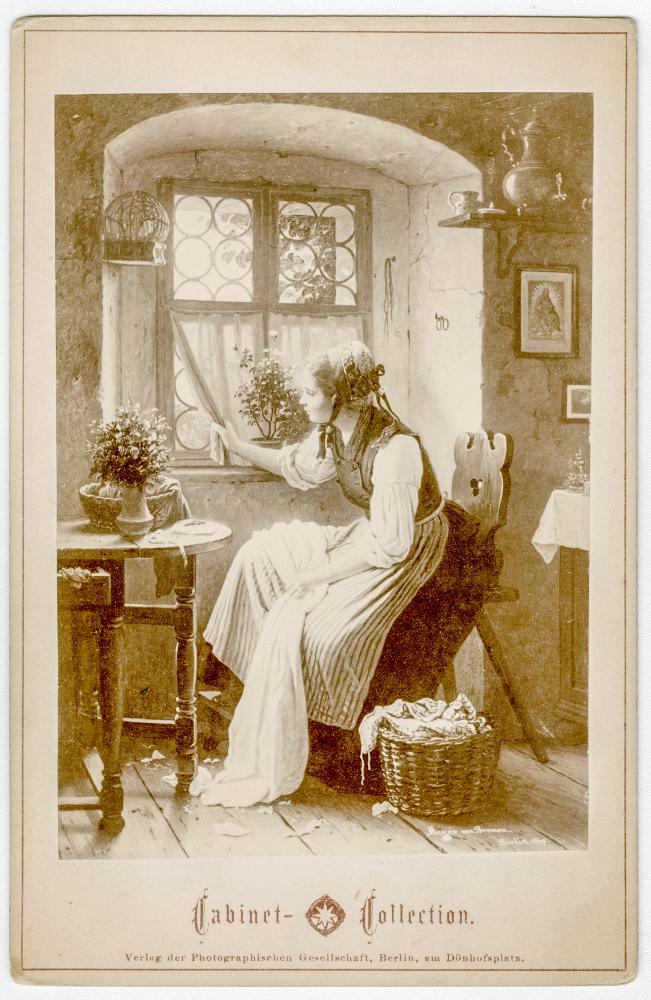 • Kabinettkort med avfotograferat konstverk. "Erwartung" (Väntan) av Meyer von Bremen. Förlag: Photographischen Gesellschaft, Berlin.