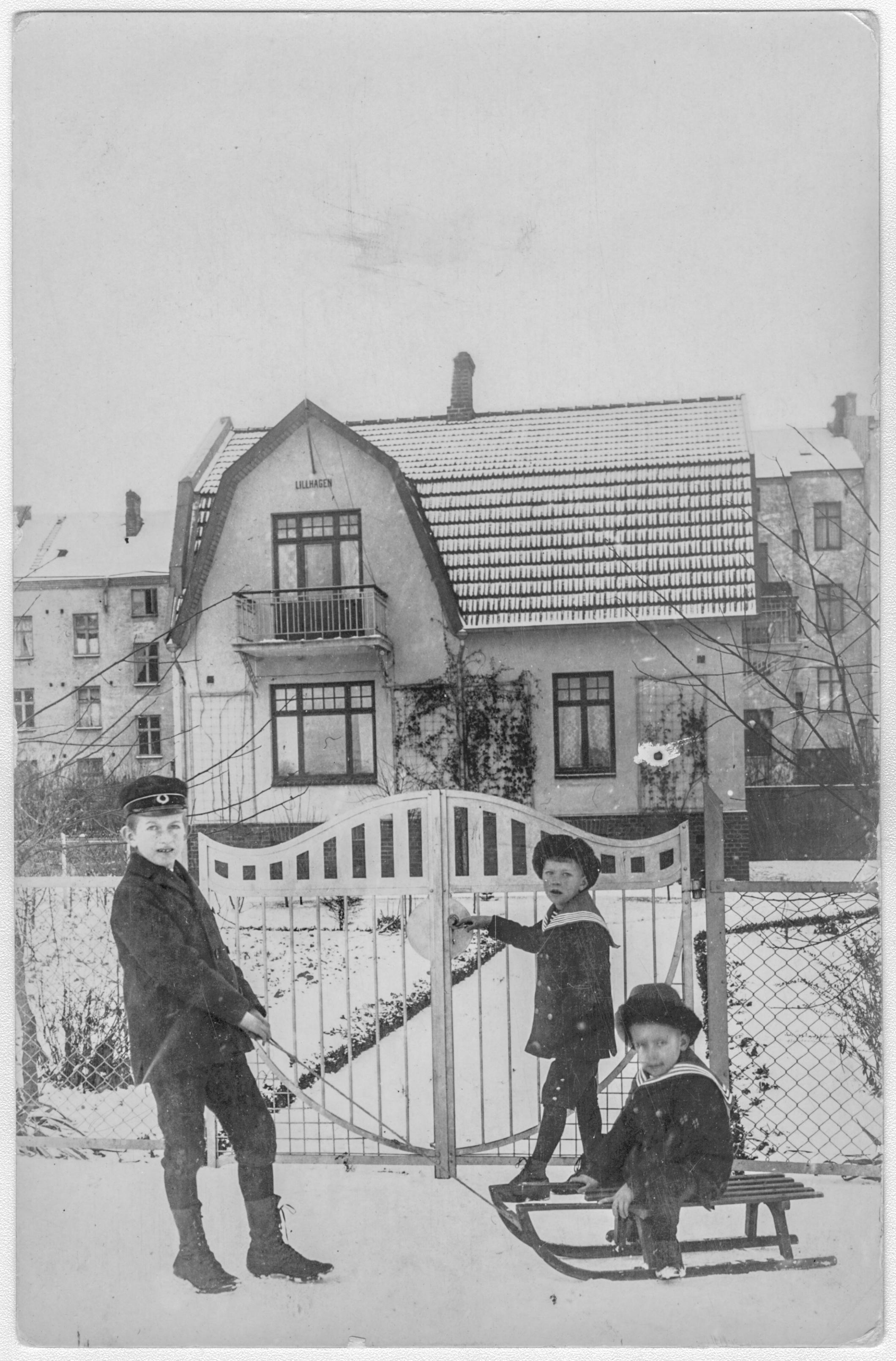 • Exteriör villa Lillhagen i vinterskrud - tre barn och kälke vid grinden. Vykort adresserat till Borås, till familjen Rosenberg - Josef R. - lokförare