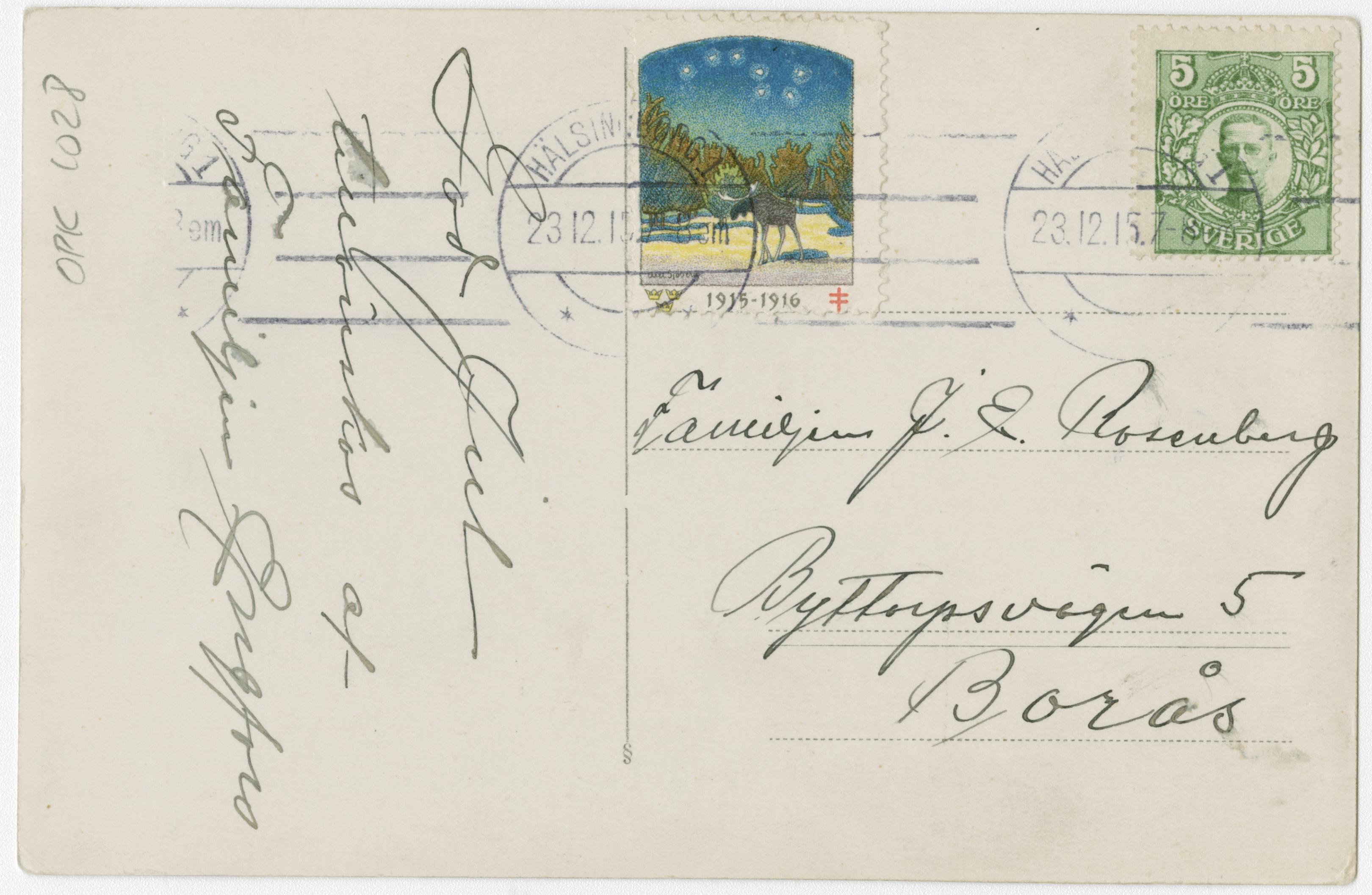 Påskriften lyder: "God Jul tillönskas af Familjen Engfors". Adressen är angiven till: "Familjen J. E. Rosenberg Byttorpsvägen 5 Borås". Postgånget vykort.