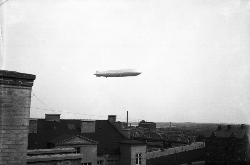 • Stadsvy (från ateljén ?) - luftskepp över industriområde. Troligen luftskeppet LZ 126 ZR III som flög över Malmö i september 1924.
