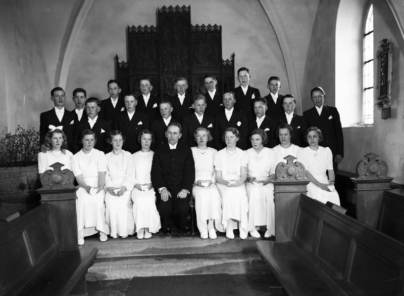 • Kyrkointeriör - konfirmander framför altaret - Gödelöv