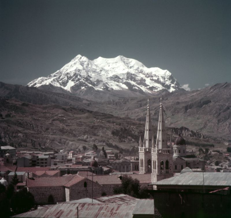 • La Paz med kyrkan San Calito? och det snöklädda berget Illimani i bakgrunden.