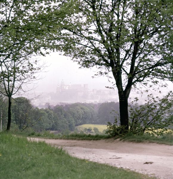 • Landskapsvy. Lummig skogsbygd med smal grusväg. I bakgrunden skymtande genom dimman ser man slottsbebyggelse.