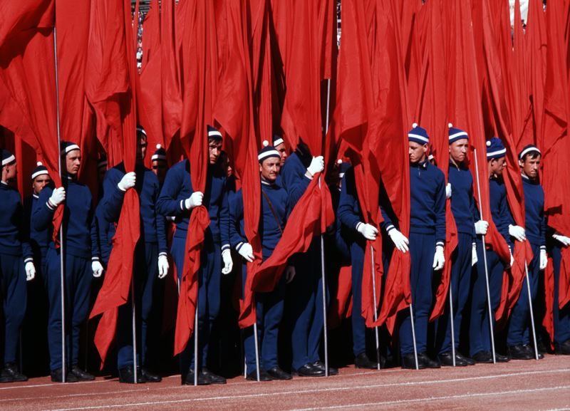 • Första maj-firandet. Ryska idrottsmän i blå overaller med röda flaggor står intill löparbana.