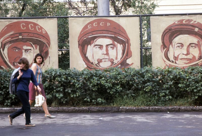 • Kvinnor går förbi tre annonstavlor av kosmonauter.