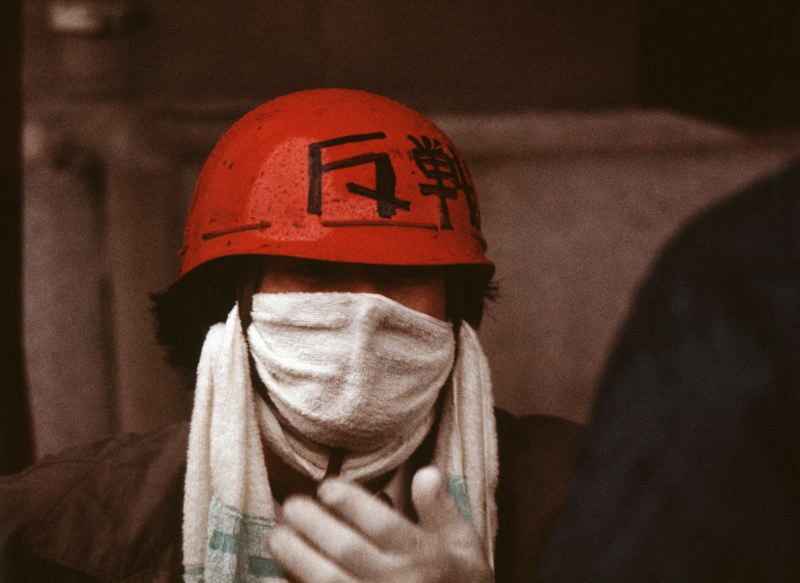 • Arbetare iförd en röd hjälm, halsduk över munnen och vit handske.