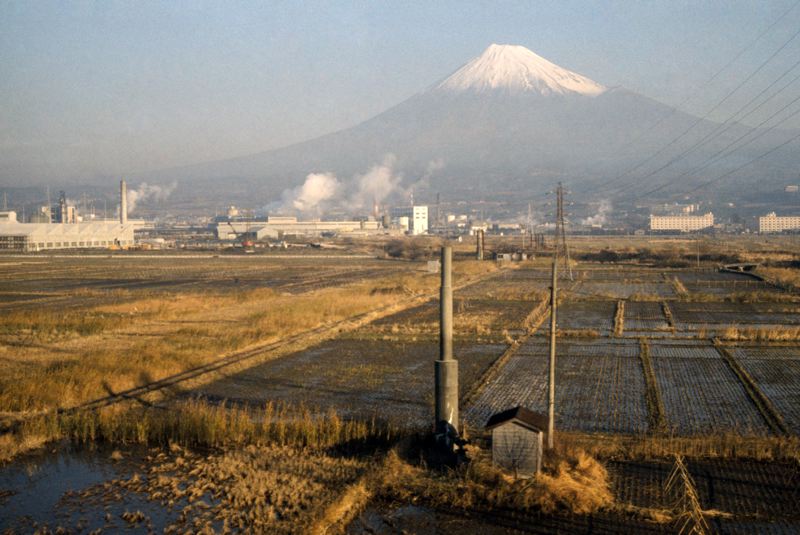• Vy över landskap med jordbruk och industriområde och vulkanen Fuji i bakgrunden.