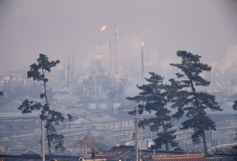 • Industrianläggning. Eventuellt ett raffinaderi. Smog (luftföroreningar) i området.