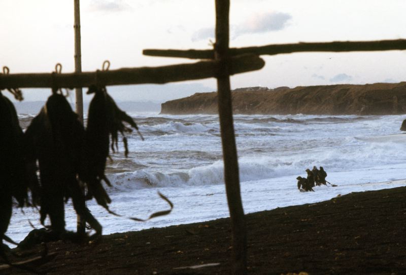 • Tre kvinnliga tångplockare går längs strandkanten, i förgrunden hänger tång på tork.