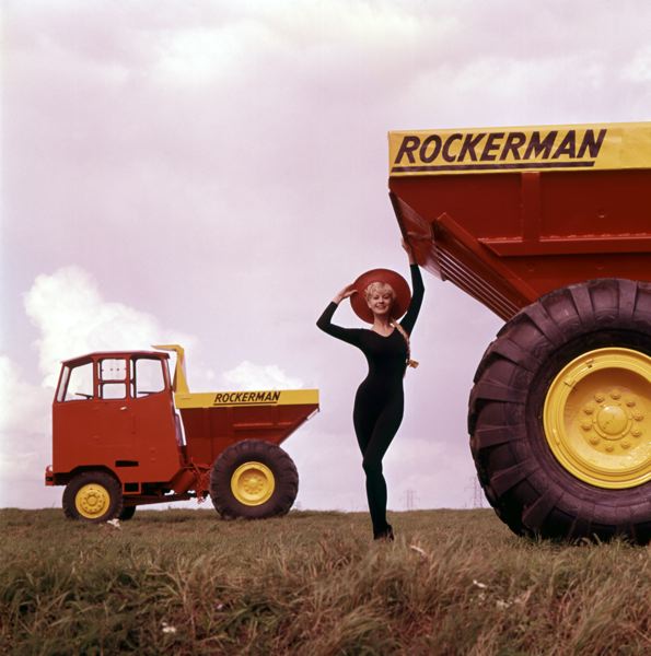 • Modefoto, ung kvinna klädd i rosa stråhatt och lutar sig mot en hjullastare.