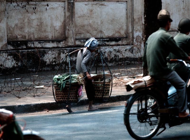 • Gatutrafik, män på moped och cykel, vid trottoarkanten går en man som bär ett ok med två korgar över axlarna.