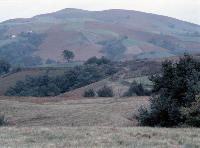 • Odlingslandskap, hus med åkrar i dalgången och längs kullens sluttning, i förgrunden gräs- och buskvegetation.