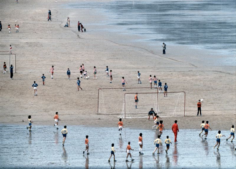 • Människor på en strand, i förgrunden pågår två fotbollsmatcher.