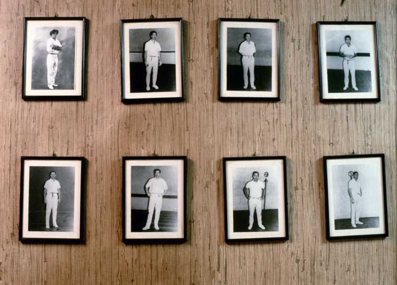 • Inramade fotografier av pelotaspelare hänger på en vägg.