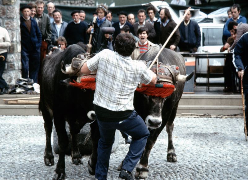 • Underhållning, tävling med dragdjur. Här ett oxspann som drar en stor fastspänd sten medan två män, en fram och en där bak, driver på djuren längs en bana kantad av publik.