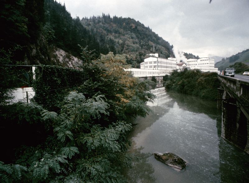 • Fabrik som ligger intill ett vattendrag, väg med bil och lastbilstrafik går precis bredvid fabriken som ligger i ett skogbevuxet bergigt område.