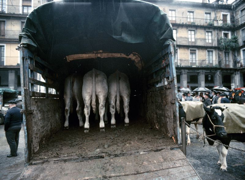 • Stadsbebyggelse, djurmarknad i förgrunden en djurtransportbil med tre ilastade kor.