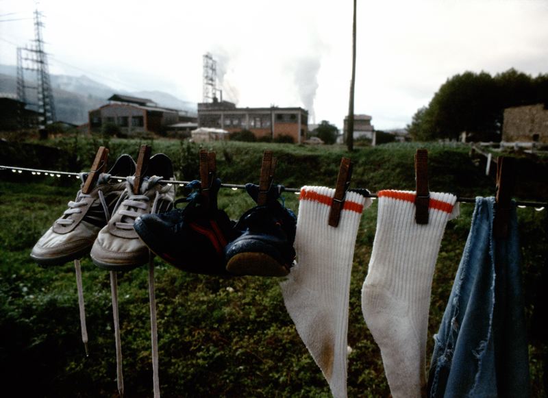 • Tvätt bestående av bl. a. skor och strumpor hänger i förgrunden, i bakgrunden syns berg och flera fabriksbyggnader.