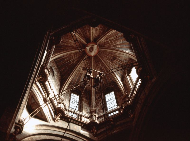 • Kyrkointeriör, upphängningsanordning för kyrkklocka.