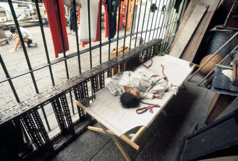 • Ett litet barn ligger och sover på en tältsäng som står på en uteplats, avskild från trottoaren utanför med ett järngaller.