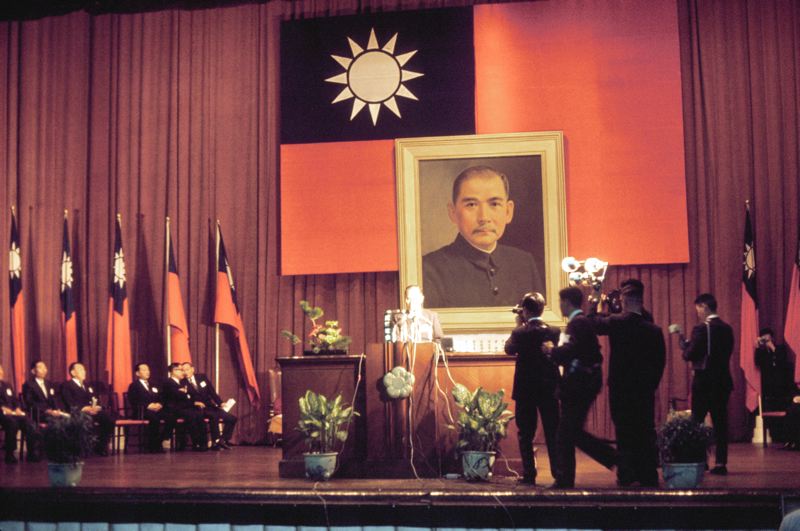 • Ett podium kantat av taiwanesiska flaggor, till vänster sitter flera politiker, flera fotografer tar bilder av en talare som står framför ett stort porträtt.