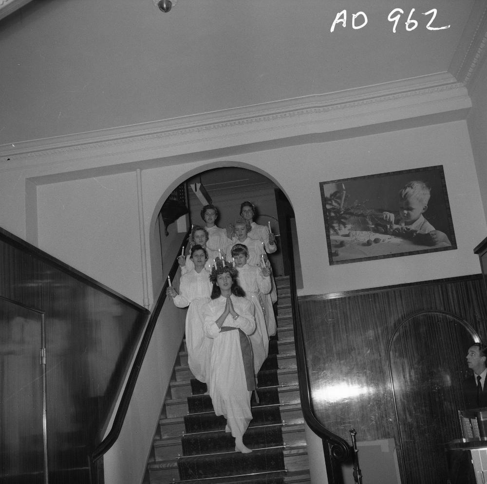• Luciatåg på varuhuset Stölten & son. Luciatåget på väg nerför trappan