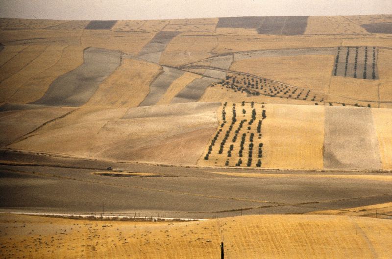 • Odlingslandskap, åkermark och flera olivlundar spridda över landskapet. I förgrunden framför vägen betesmark med tamdjur på bete.