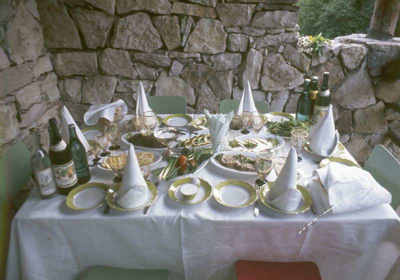 • Vackert uppdukad måltid med linneduk och servetter, bordet är uppställt ute intill hörnet på en stenvägg, eventuellt på en balkong eller en terrass.