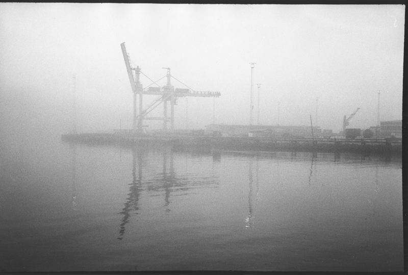 • Utsikt från kajen bakom M-2:an mot containerplattan kl. 7. 05 en tjockdimmig morgon.