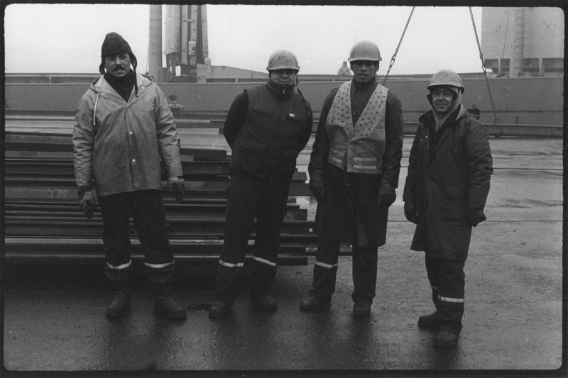 • Rälslastning på båten Rania, fr. v. Rogelio Diaz och René Gonzales från Chile, "Tito" (Algeriet) och Juan (Chile).