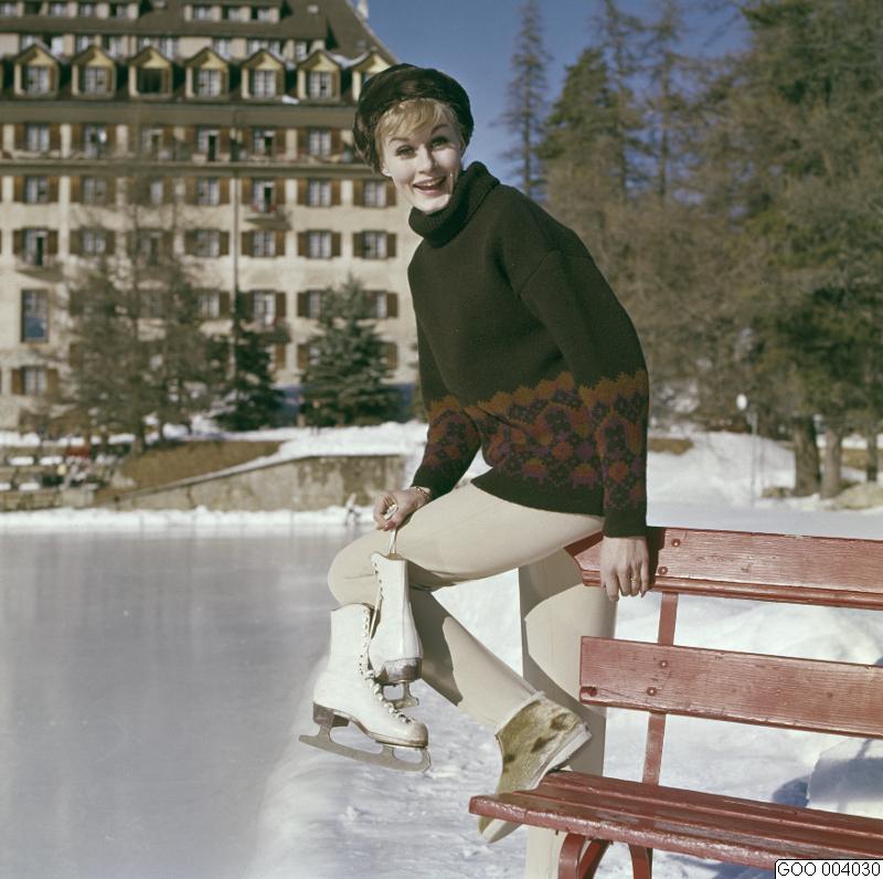 LAVINIA. Modell klädd i beige byxor med grön stickad polotröja, ljusbrunt, lila och rostfärgat mönster. Pälsmössa. Modebild såld via bildbyrån "Tio Fotografer"