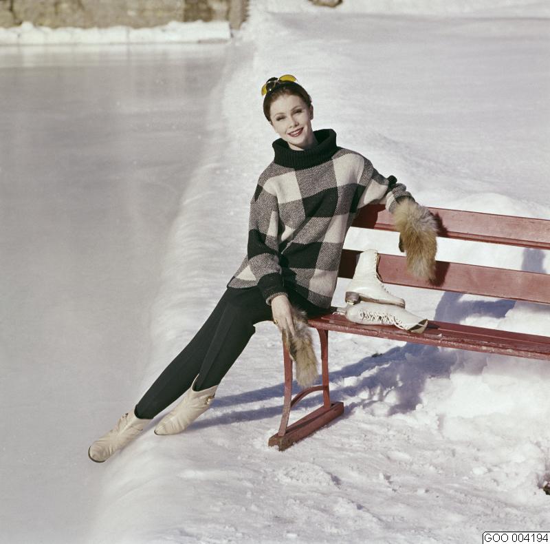 • LAVINIA. Modell klädd i svarta byxor stickad rutig polotröja i svart och vitt. Pälsvantar. Modebild såld via bildbyrån "Tio Fotografer"