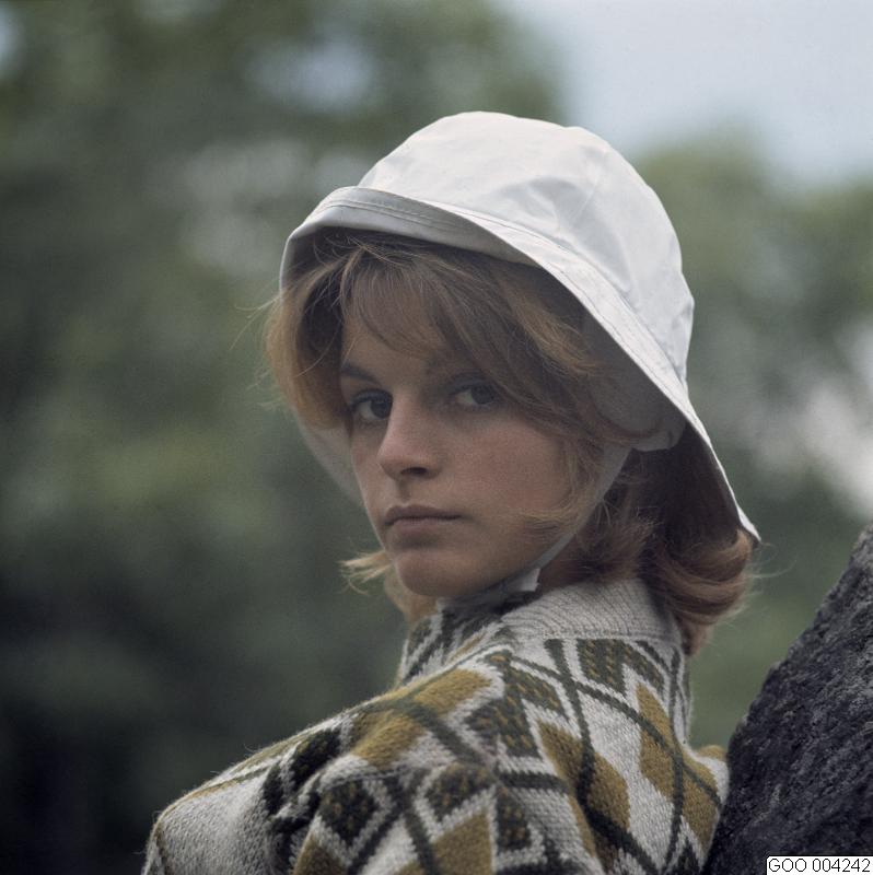 • LAVINIA. Modell klädd i mönstrad stickad tröja i grått, grönt och brungult. Vit sydväst. Modebild såld via bildbyrån "Tio Fotografer"