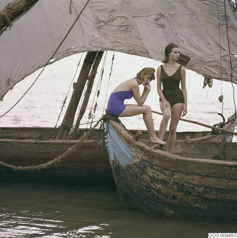 • Modeller klädda i baddräkter i lila och mörkgrönt. Matchande hårband. LAVINIA. Modebild såld via bildbyrån "Tio Fotografer".