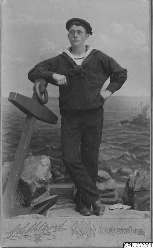 • Man i uniform - sjöman. Målad fond, ankare.