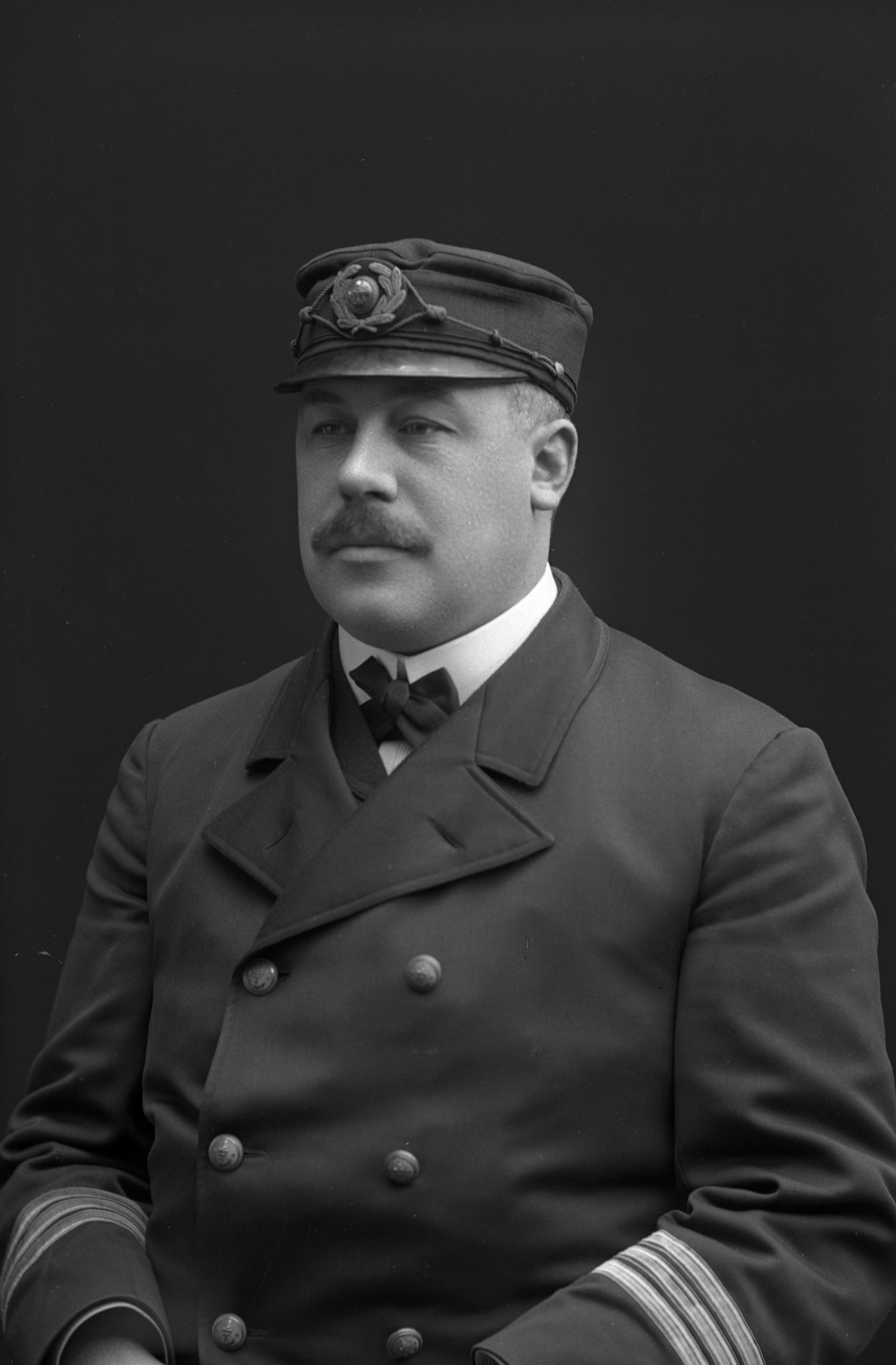 • Porträtt i halvfigur av sjökapten Frelin, iklädd kaptensmössa med emblem.