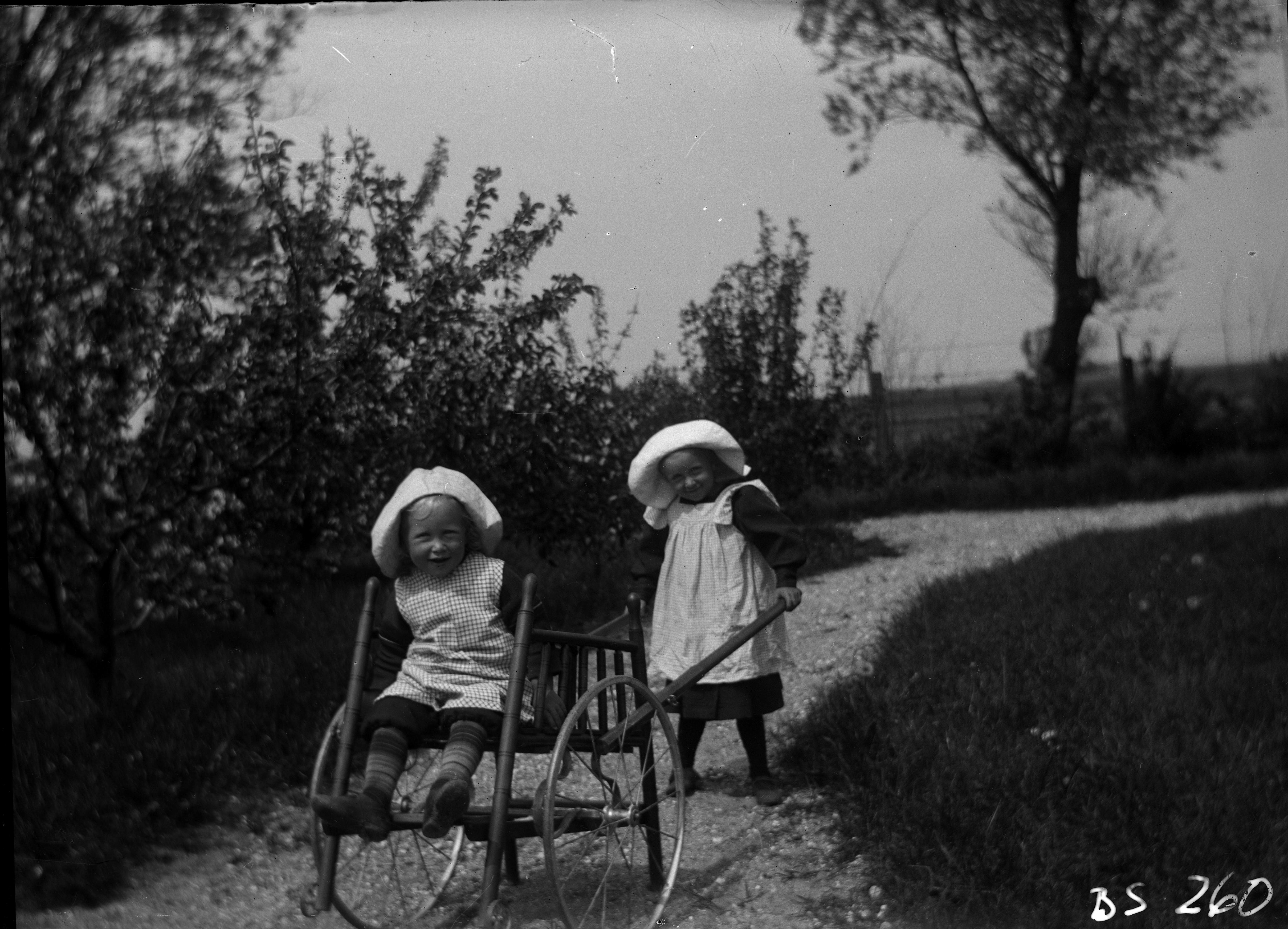 • Fotografi av Gunhild och Sixten Sjöberg, lekande med dragvagn, i trädgårdsmiljö.
