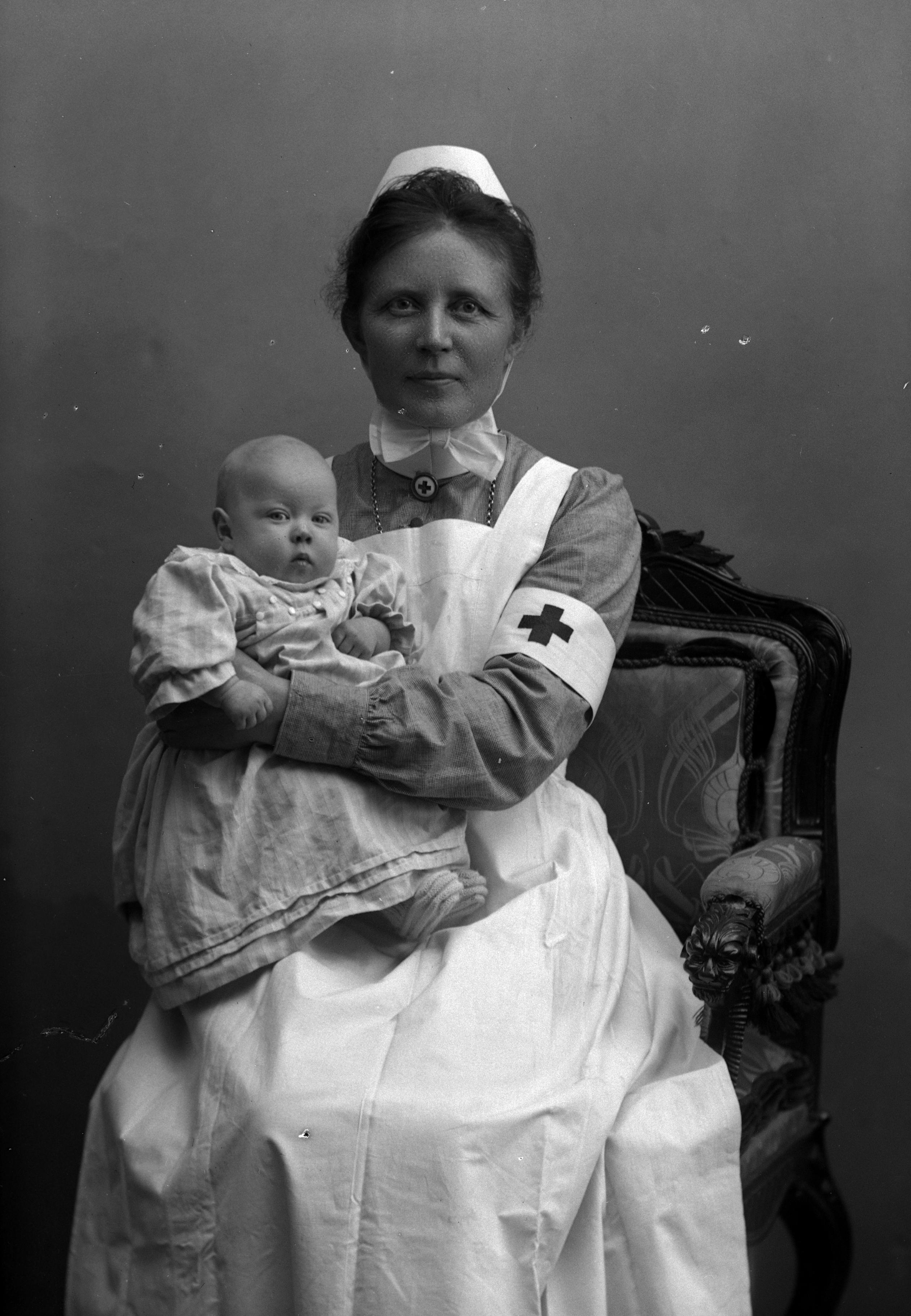 • Porträtt i helfigur av Ingrid Nilsdotter Linders, iklädd sjuksköterskeuniform, sittande på stol med spädbarn i knät.
