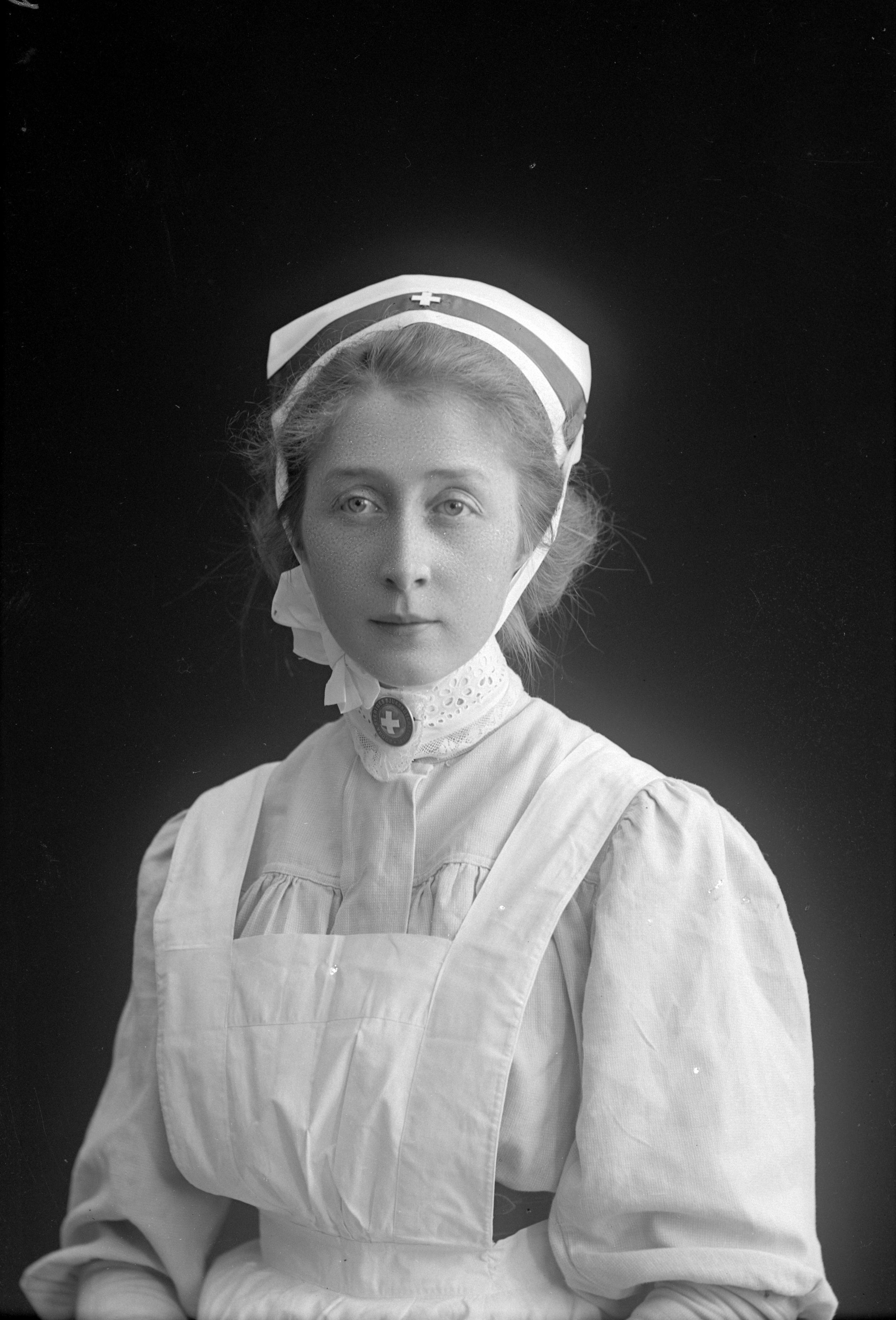 • Porträtt i halvfigur av Elsa Nyström, iklädd sjuksköterskeuniform.