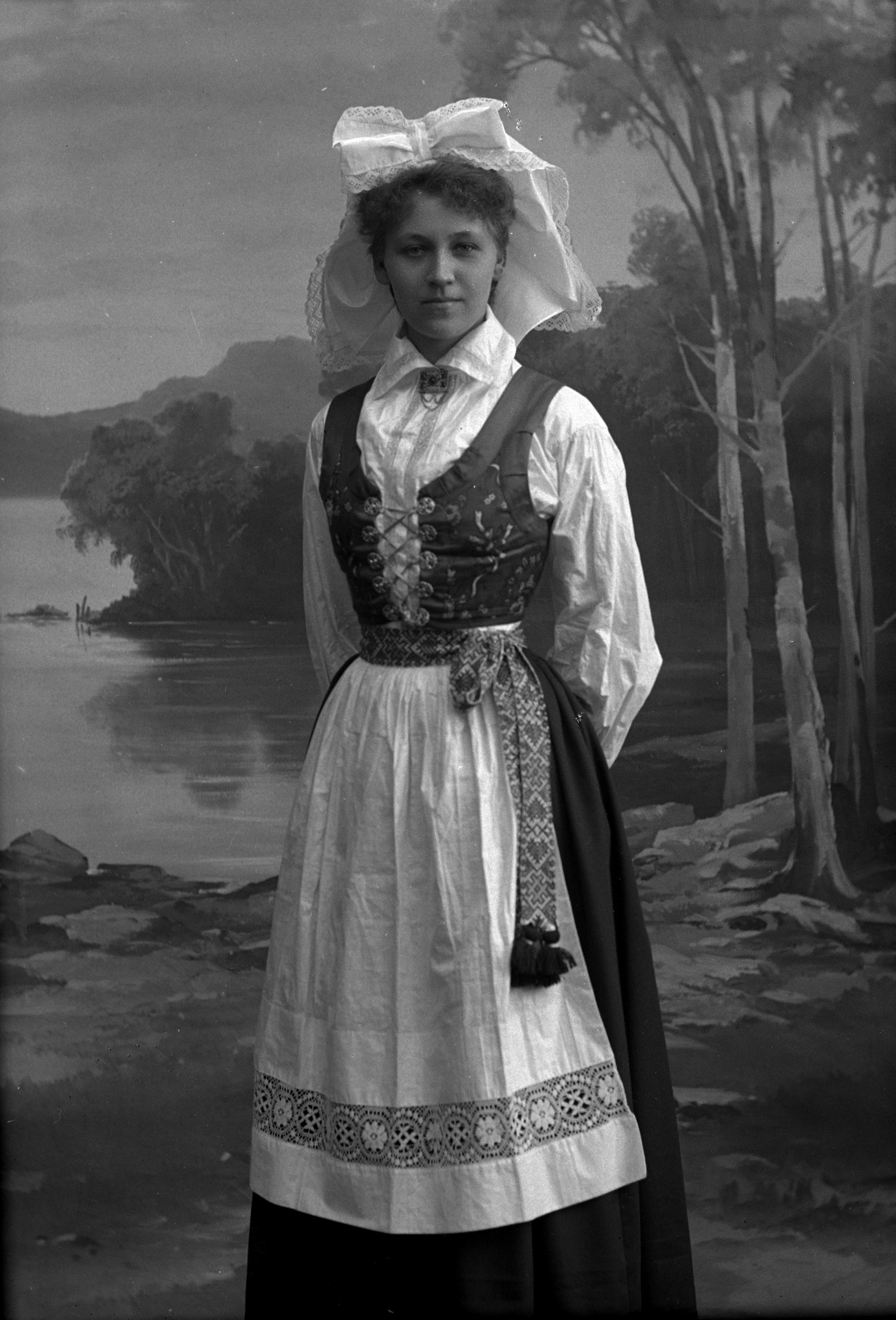 • Porträtt i helfigur av fröken Sjöberg, iklädd folkdräkt, stående vid staket. Ateljéfond med skogs- och insjömotiv utgör bakgrunden.
