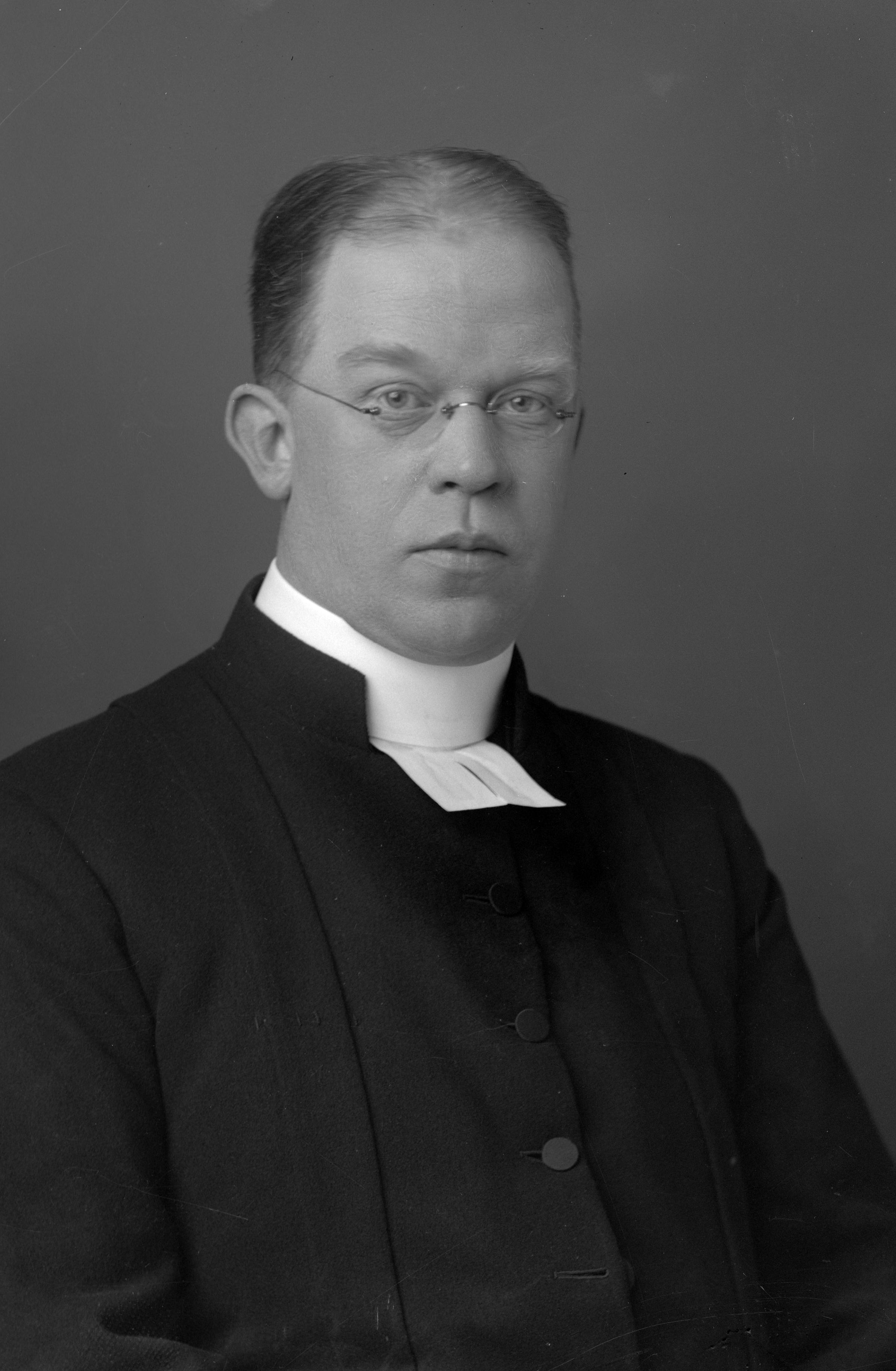 • Porträtt i halvfigur av kyrkoherde Albert Lysander, iklädd yrkesklädsel med prästkrage.