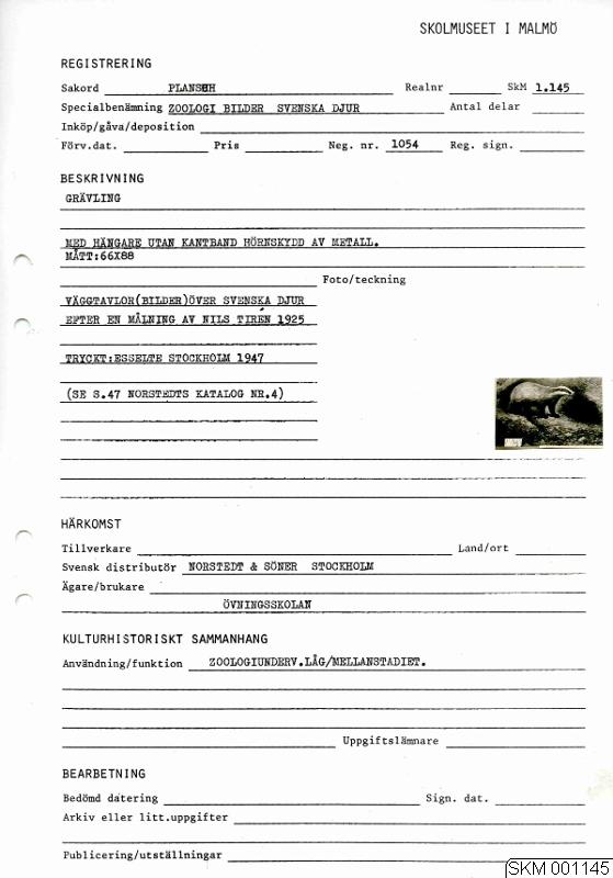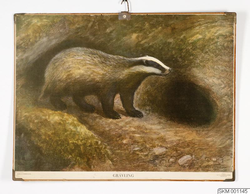Grävling, med hängare utan kantband, hörnskydd av metall. Väggtavlor (bilder) över svenska djur efter en målning av Nils Tirén 1925. Tryckt: Esselte Stockholm 1947. (Se s. 47 Norstedts katalog nr. 4).