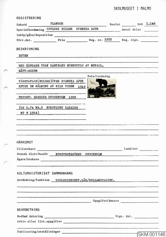 Björn, med hängare utan kantband, hörnskydd av metall. Väggtavlor (bilder) över svenska djur efter en målning av Nils Tirén 1919. Tryckt: Esselte Stockholm 1950. (Se s. 74 nr. 5 Norstedts katalog no 9 1924).