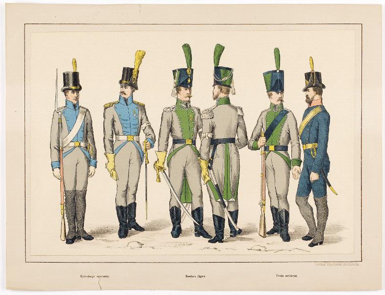 • Uniformsplansch, färglagd litografi. Föreställer uniformer för Björneborgs regemente, Savolaks jägare och Finska artilleriet.