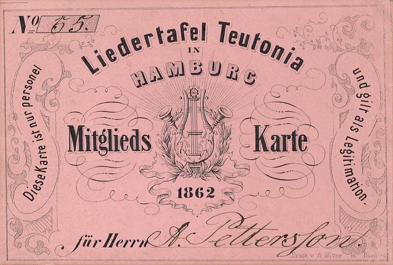 Medlemskort tryckt i svart på rosafärgat papper med tryckt dekor av romber och ornament. Text: No 55 / Liedertafel Teutonia / in / Hasmburg / Mitglieds-Karte / 1862 / für Herrn A. Pettersson / Diese Karte ist nur personel / und gilt als Legitimation