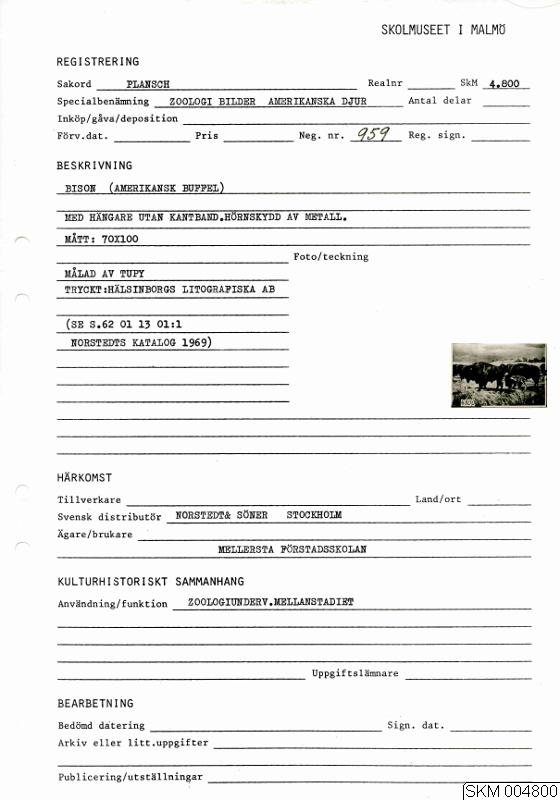 Bison (Amerikansk buffel), med hängare utan kantband. Hörnskydd av metall. Målad av Tupy. Tryckt: Hälsingborgs Litografiska AB. (Se s. 62 01 13 01:1 Norstedts katalog 1969).