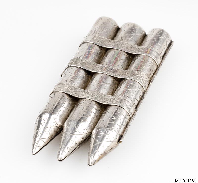 • Cigarrfodral av metall med plats för tre cigarrer. Inristad dekor med tre stycken metallband som går över fodralet. På det ena metallbandet står det "C. Stadler".