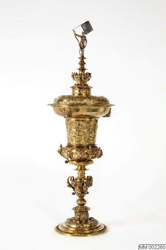 Pokal av förgyllt silver, graverad dekor. Pokalens lock kröns av en krigarfigur stående på en urna och bärande en sköld med monogrammet FS [Fridericus] samt prydes för övrigt av 4 större ovala medaljonger med mytologiska scener samt, omväxlande med de större medaljongerna, 4 mindre cirkelrunda med bröstbilder av antika krigare; mellanrummen mellan medaljongerna utfylles med av beslagsornament i fö...